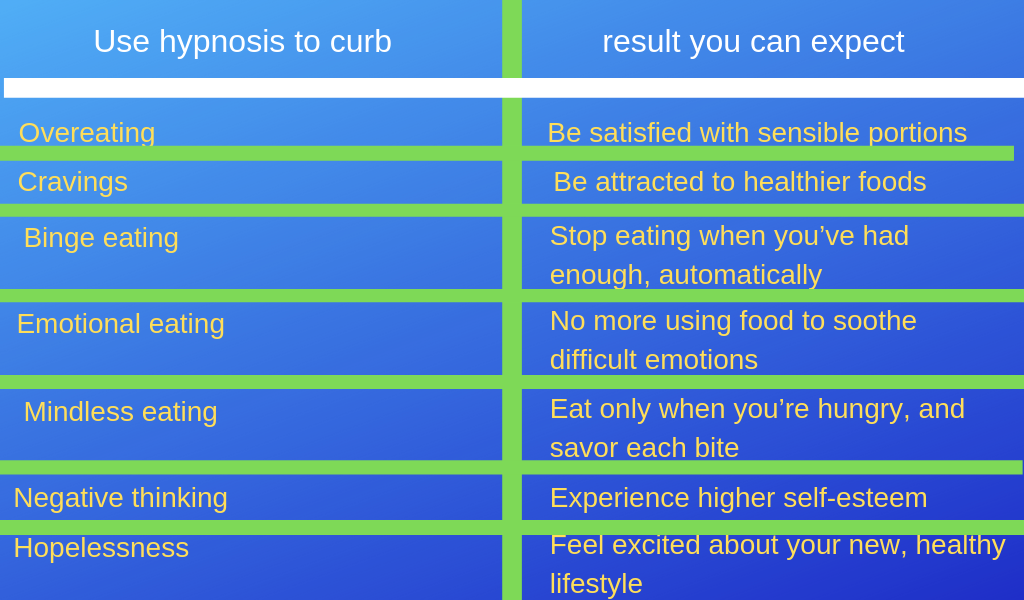 Using this weight loss hypnosis audio I was able to break the bad habits that have failed me before. I am eating when I am really hungry, I do not have cravings for junk food and eat a smaller portion and support my weight loss journey.